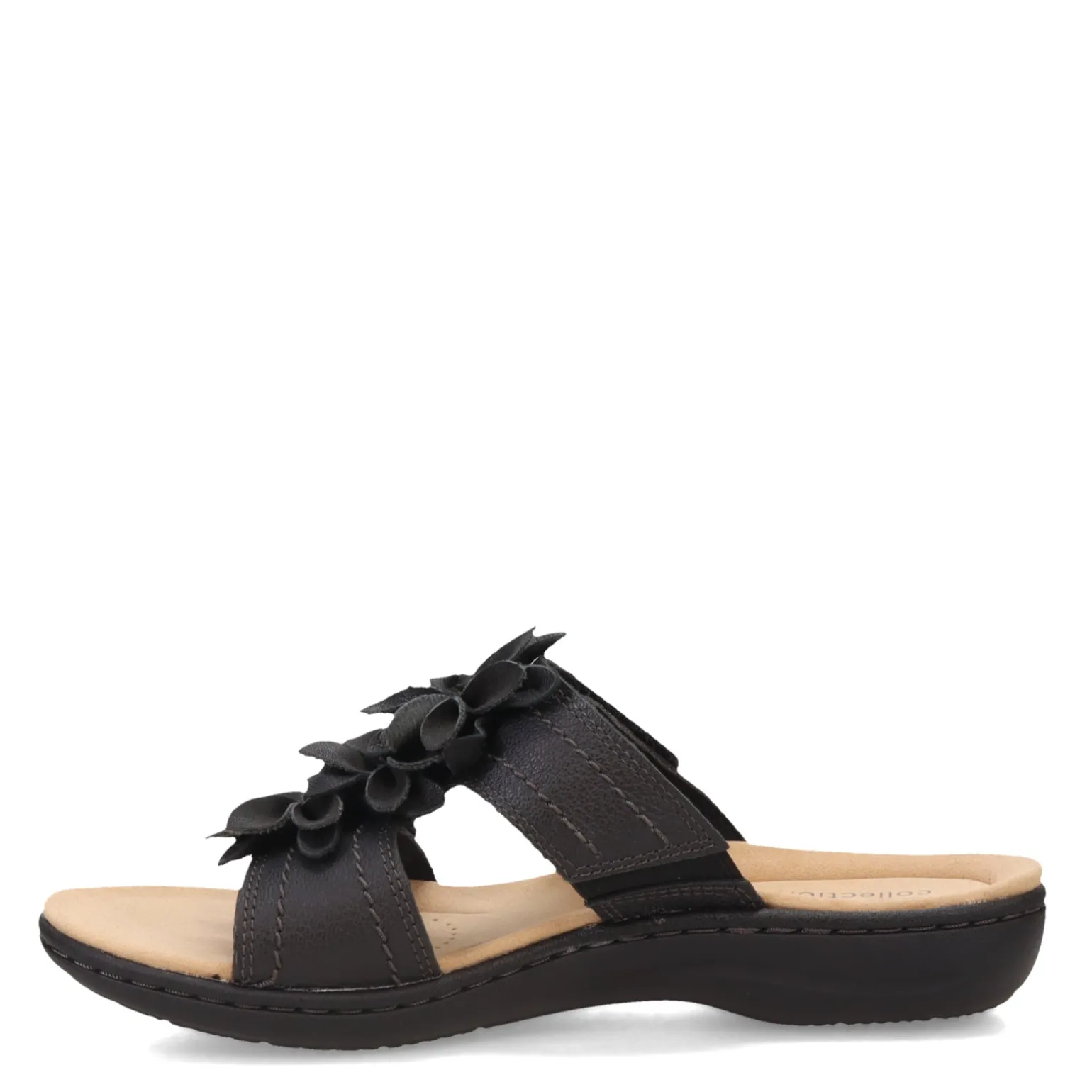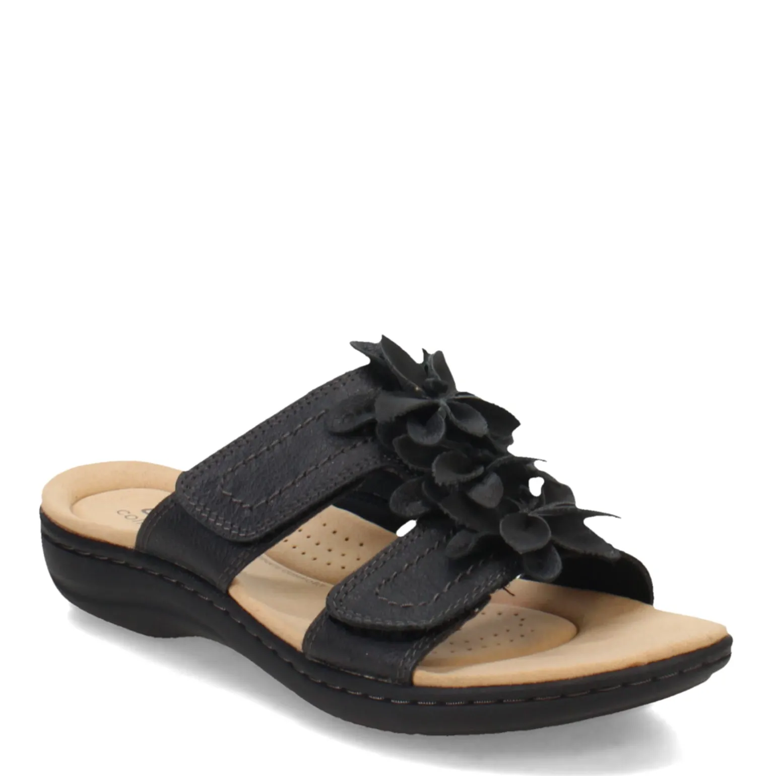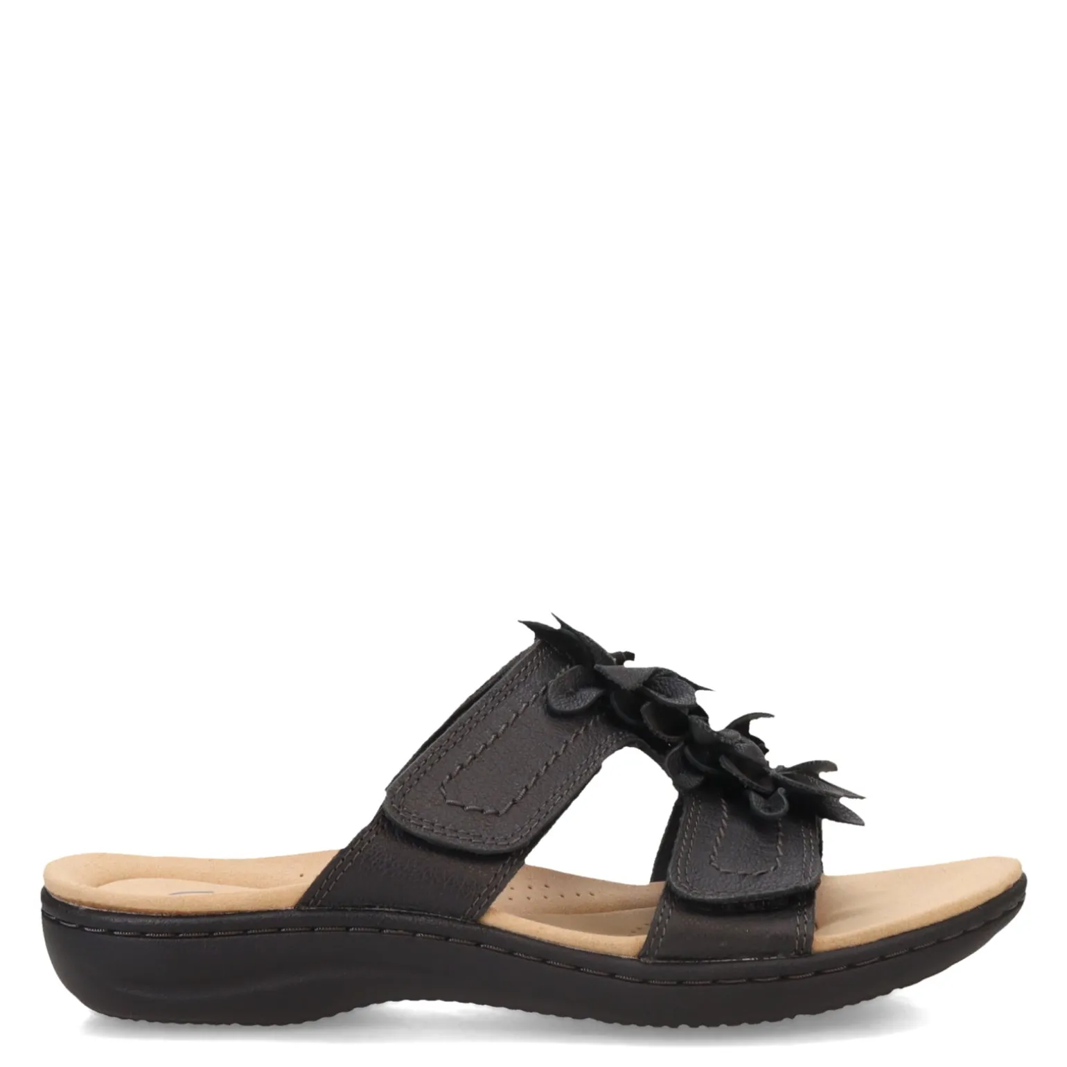 - Leather and manmade upper with decorative floral embellishment