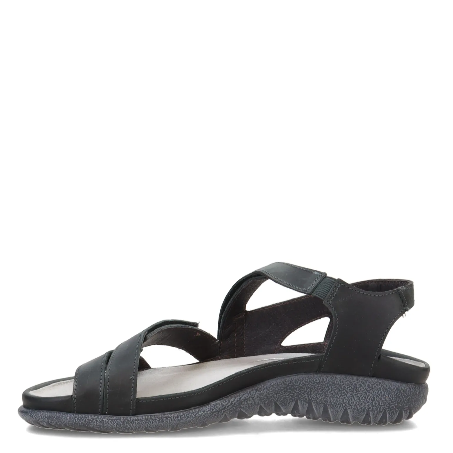 - Naot’s suede wrapped removable, anatomic cork and latex footbed molds to the shape of the foot
