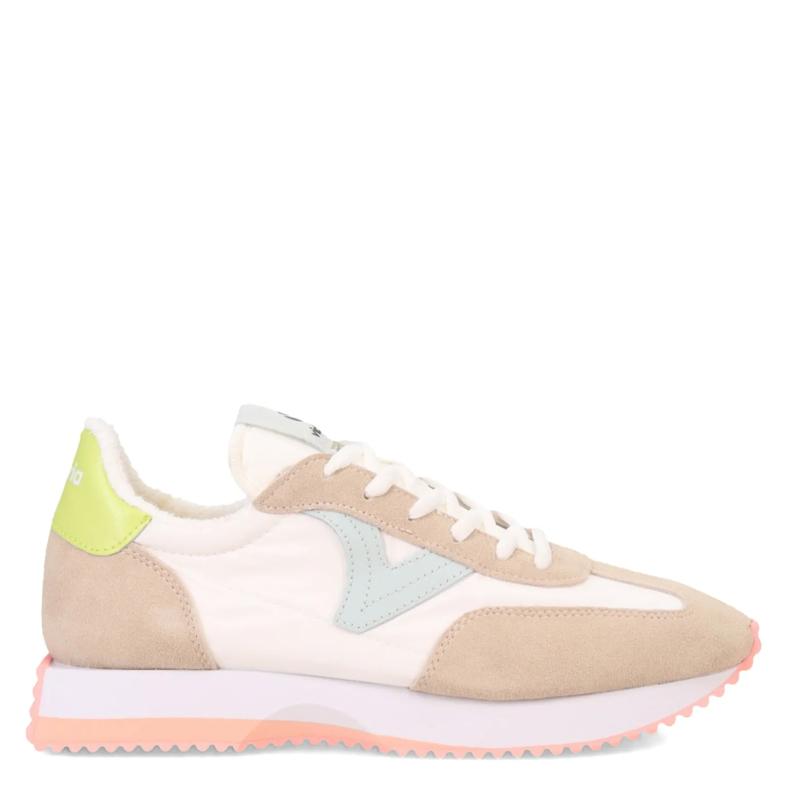 Introducing the Victoria Cosmos Sneakers, a stylish blend of retro design and modern comfort crafted from nylon and split leather overlay panels. With neon detailing on the sole and back, along with a retro V on the side and white lace fastening, these sneakers offer both eye-catching style and lightweight functionality.